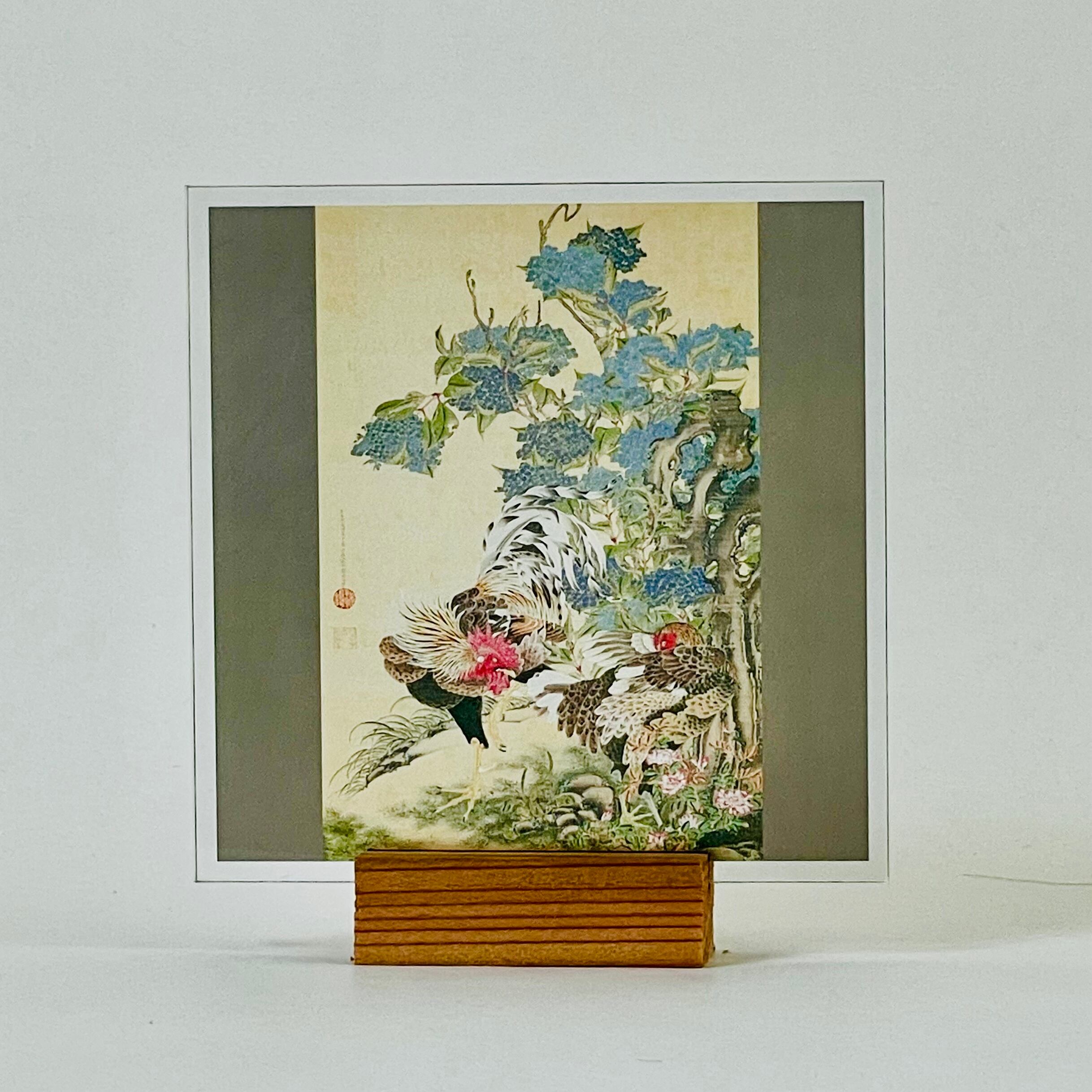 紫陽花の鮮やかな色と二羽の鶏の対比が美しい初期バージョン。
