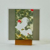 白鶏と老松の組み合わせが神聖な雰囲気を醸し出す作品。