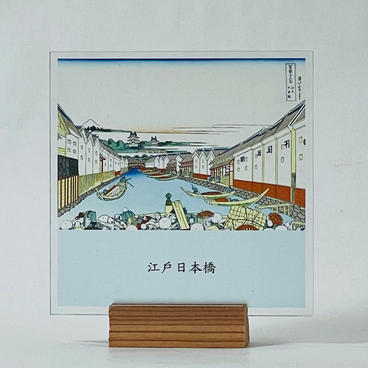 It depicts Edo Castle and Mt. Fuji in the distance, with the crowds of people passing through Edo Nihonbashi, the starting point of the Tokaido, in the foreground. Nihonbashi was the center of commerce and transportation during the Edo period.