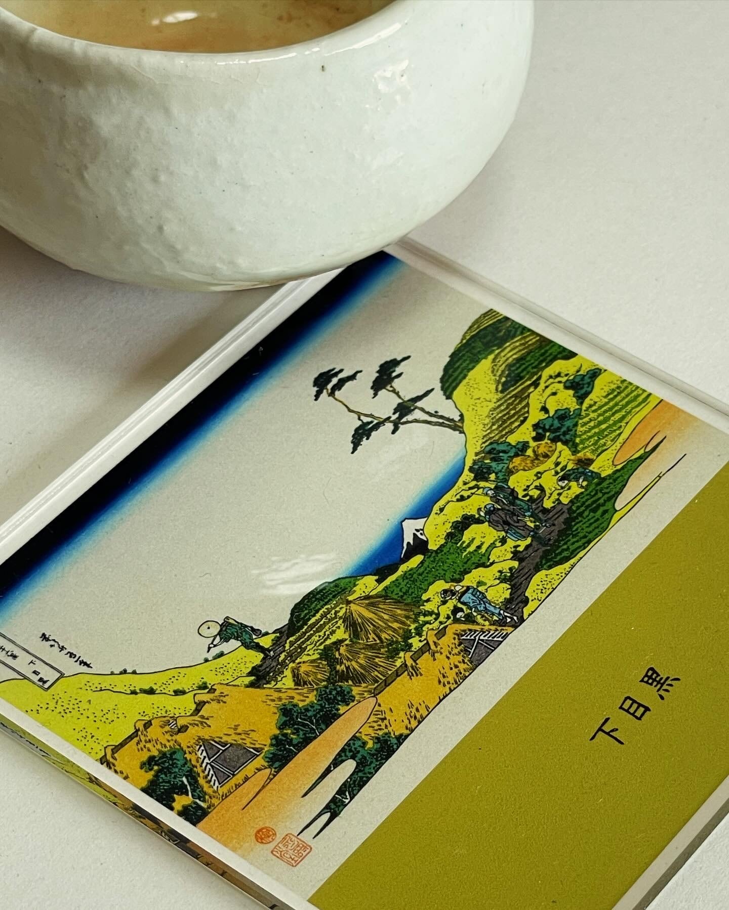 Shimo-Meguro is located in present-day Meguro Ward, Tokyo, and was a hilly area with a great view of Mt. Fuji. People such as falconers and farmers are depicted.