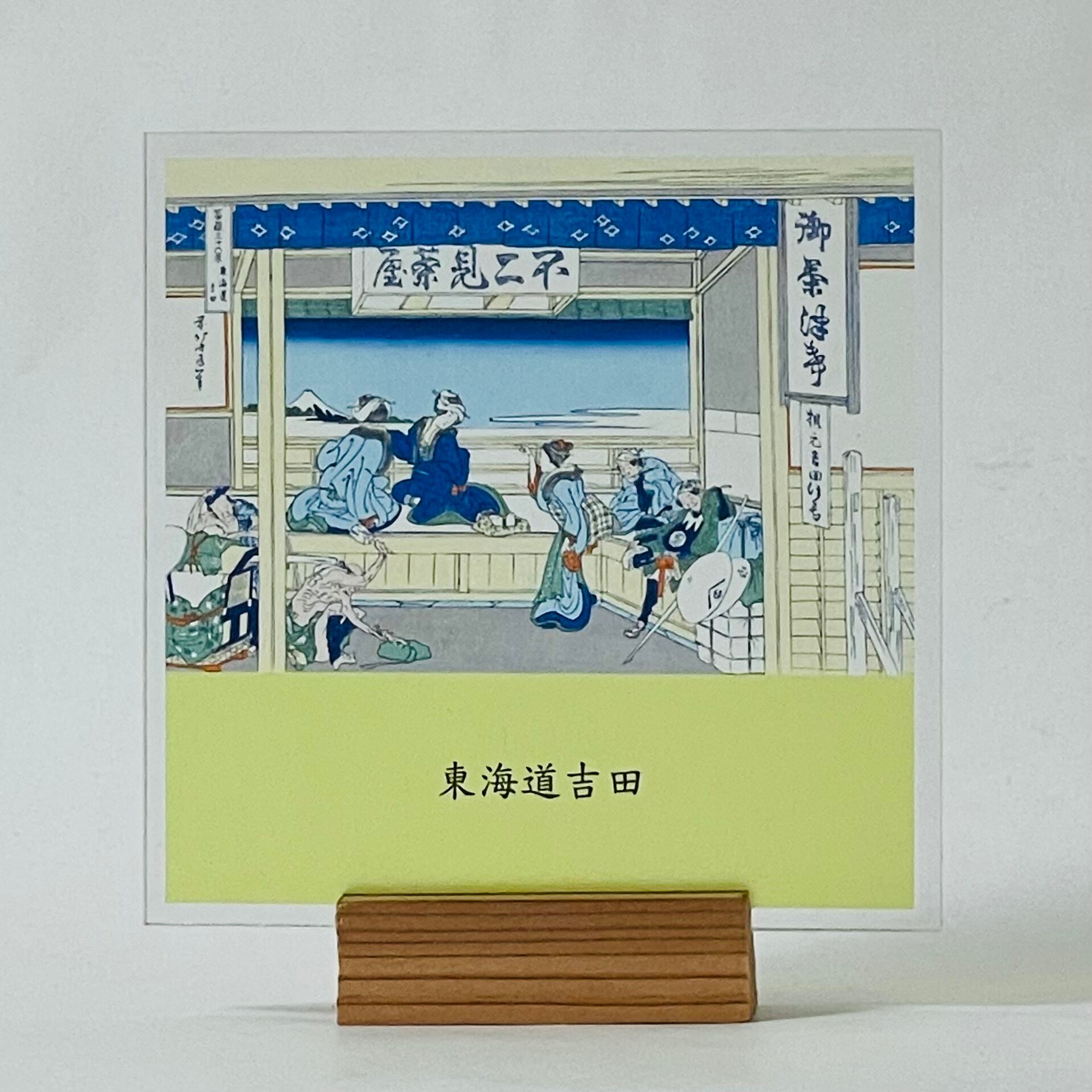 「不二見茶屋」で旅人たちが富士山を眺めながらくつろいでいる様子が描かれています。女性たちは縁台に座り、茶屋の女将から説明を受けています。