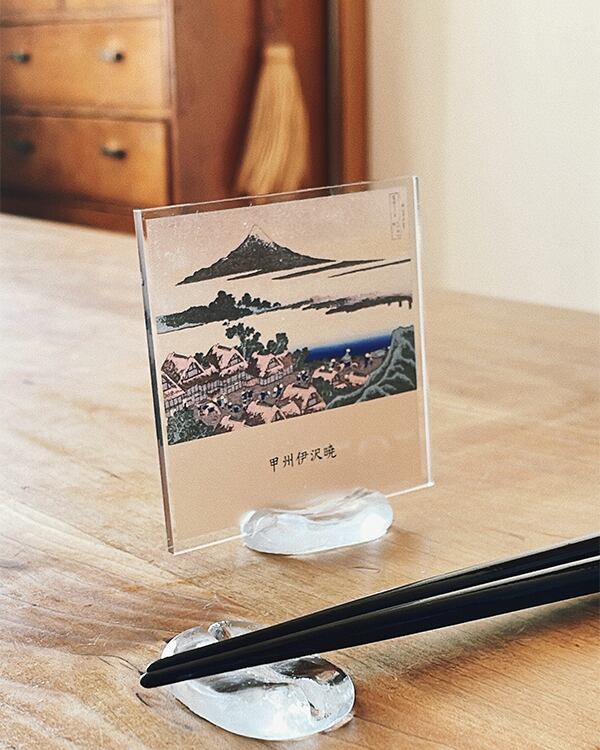 At that time, Isawa was a post station on the Koshu Kaido road, and Mt. Fuji, which can be seen from the post station, is depicted on the map. The work takes place early in the morning, and you can see the rush of people leaving the inn even after dark.