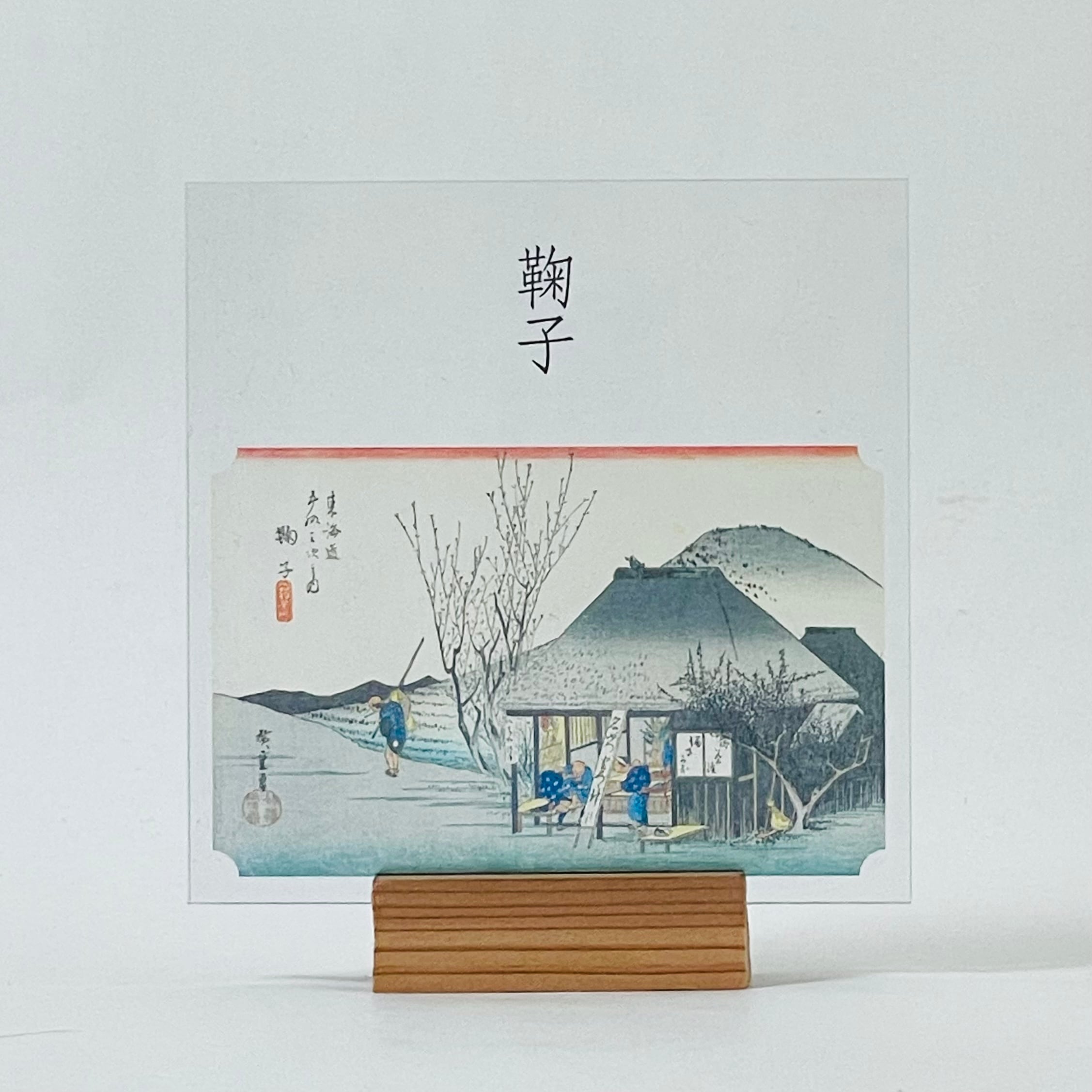 鞠子は、現在の愛知県名古屋市の宿場町です。宿場町の通りや宿場での商取引、旅人たちの姿が描かれています。また、鞠子周辺の自然や建物の美しさも表現しています。