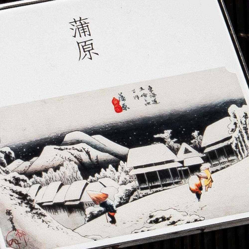 This work depicts Kanbara on a quiet winter night. The current area around Kambara-juku is a popular tourist destination, with old townscapes and historical buildings remaining.