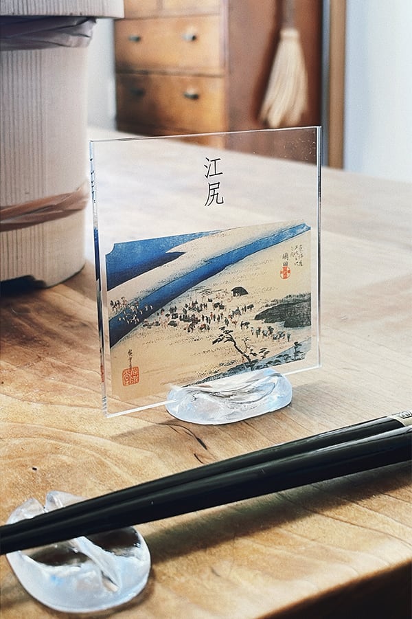 「三保遠望」とは、江尻から三保(みほ)方面を望むことを指しています。江尻宿から三保方面を望むと、遠くに富士山が連なる壮大な景観が広がります。