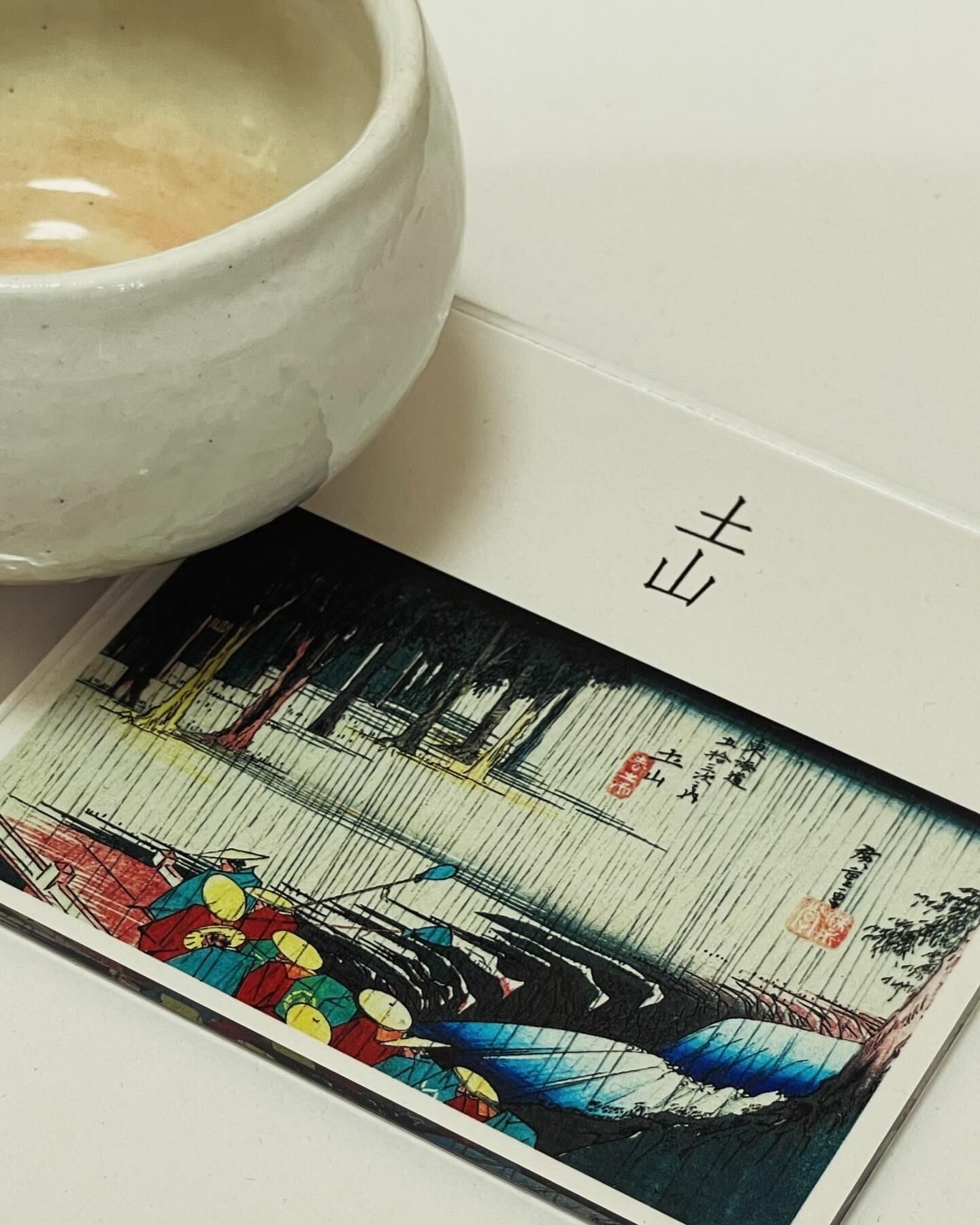 険しい鈴鹿峠を越えた先にある土山宿、ここを通る大名行列が春の雨の中を静かに進んでいく様子が描かれています。田村川は雨で水量が増え、勢いよく流れています。土山は雨の多い場所で知られています。