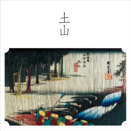 It depicts a procession of feudal lords passing through Tsuchiyama-juku, which is located beyond the steep Suzuka Pass, moving quietly through the spring rain. The Tamura River has increased in water volume due to rain and is flowing rapidly. Tsuchiyama is known as a place with a lot of rain.