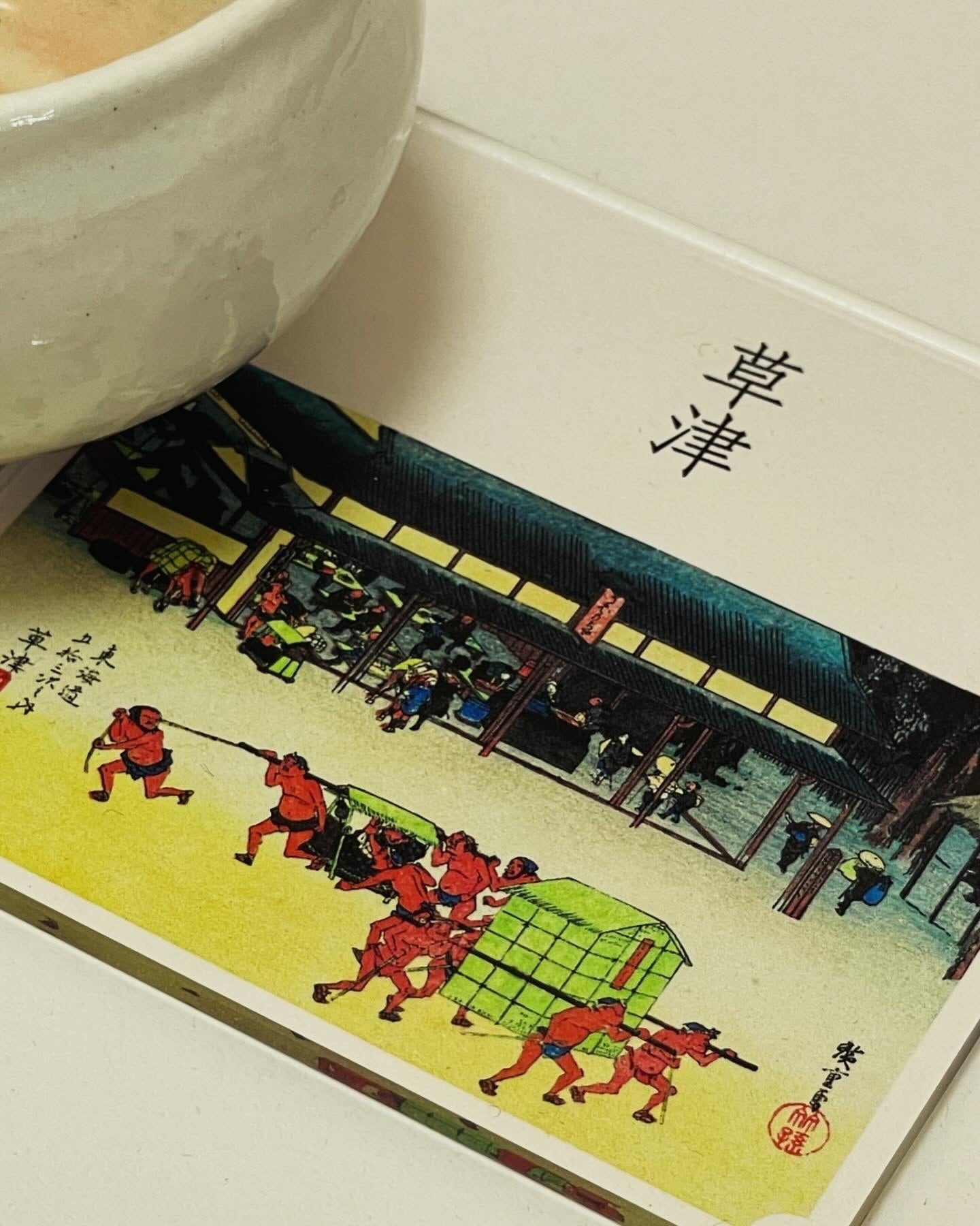 Tateba is a post town where travelers and feudal lord processions take a break and change places. Kusatsu-juku was known as a post town and a hot spring resort. It depicts a large number of travelers resting and eating in the position of a Kusatsu specialty.