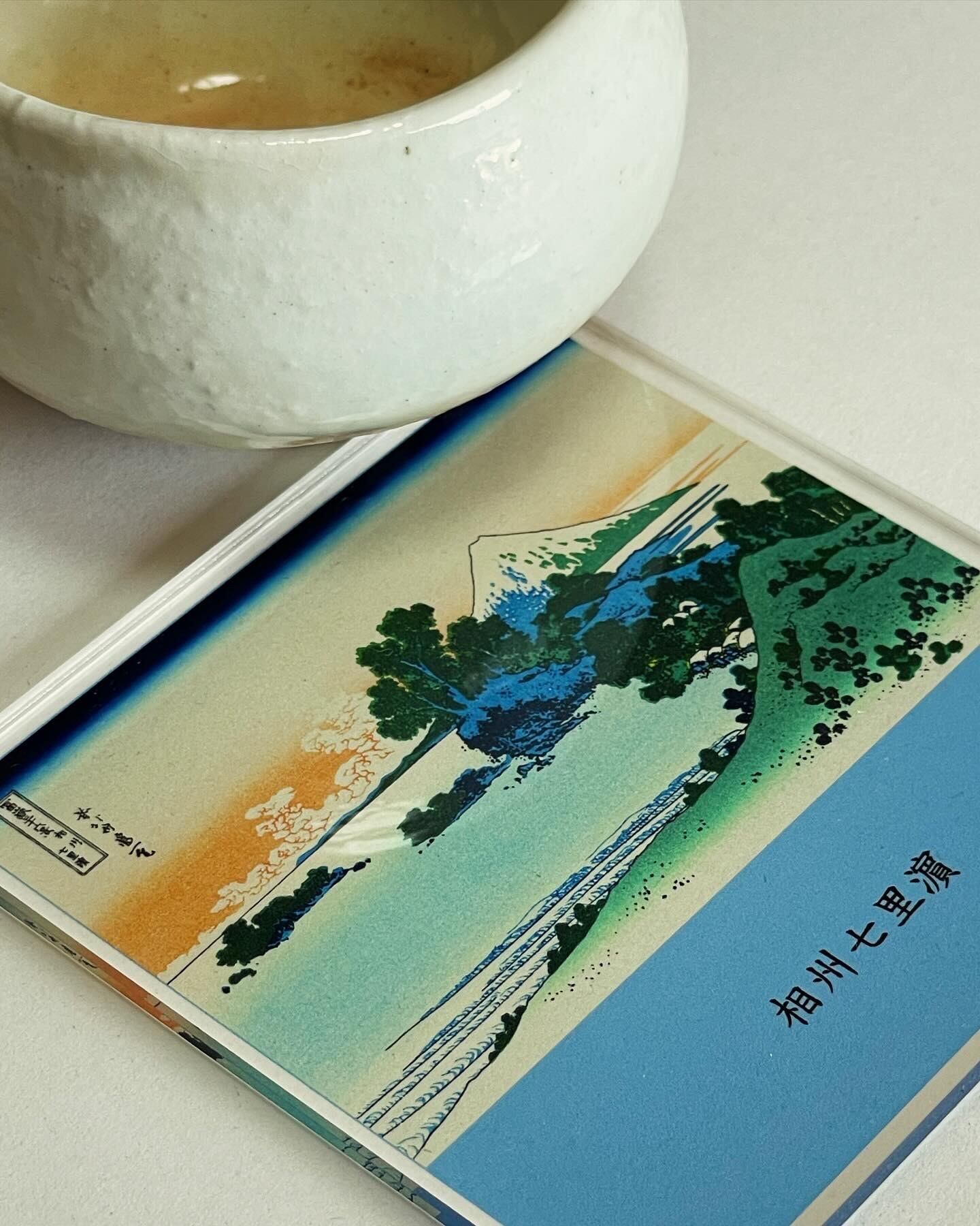 前景に鎌倉山、中景には七里ヶ浜の集落が描かれており、後景には白雪を頂いた富士山が描かれています。